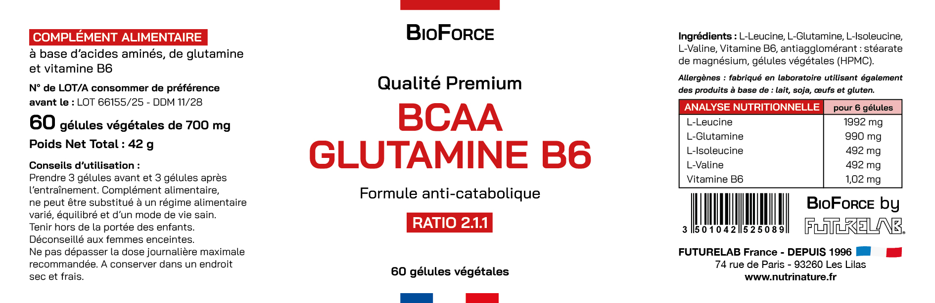 L.LEUCINE - PHOSPHATE TRICALCIQUE - L.GLUTAMINE - L.VALINE - L.ISOLEUCINE - MAGNESIUM STEARATE VEGETAL - VITAMIN B6 PYRIDOXINE.