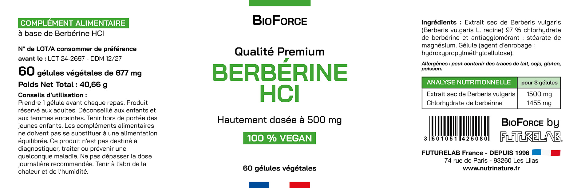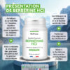 L’ajout du chlorhydrate (HCl) rend la berbérine plus stable et améliore généralement sa biodisponibilité, ce qui signifie que le corps peut mieux l’absorber.