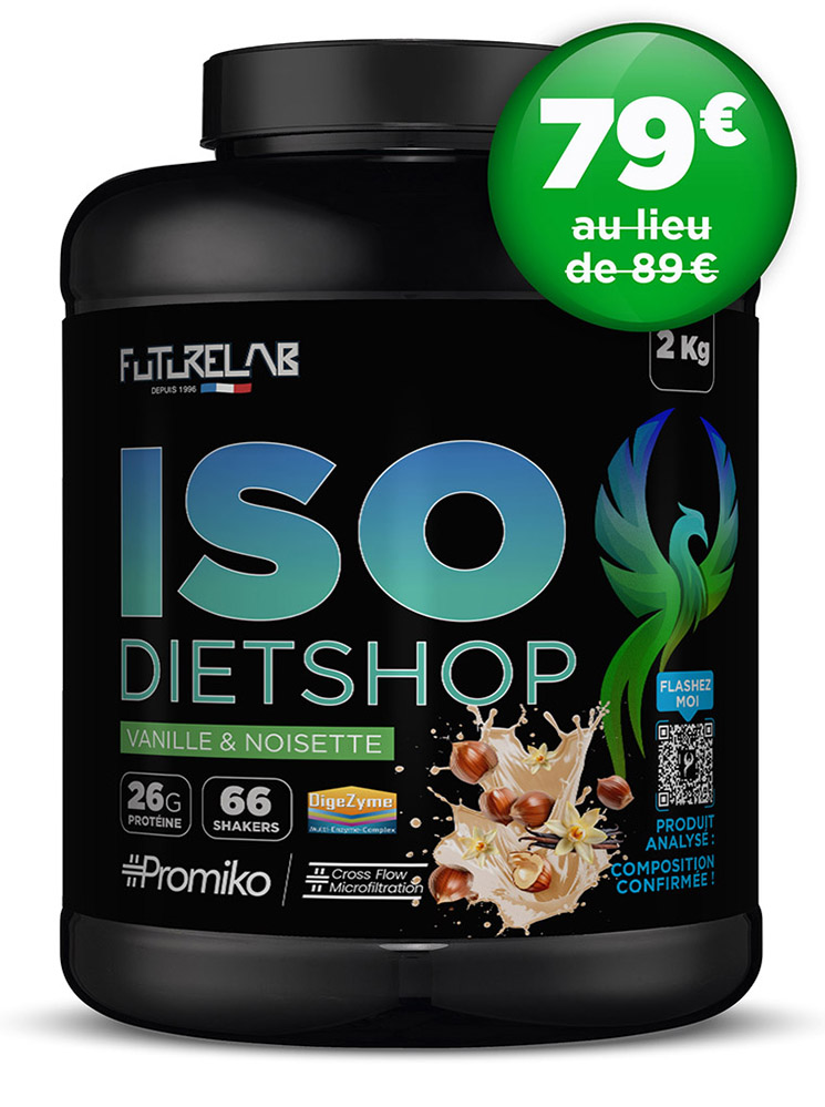 - Développement musculaire : l'ISO DIETSHOP PROMIKO® est une excellente source de protéines, essentielle pour la construction et la réparation des tissus musculaires.
