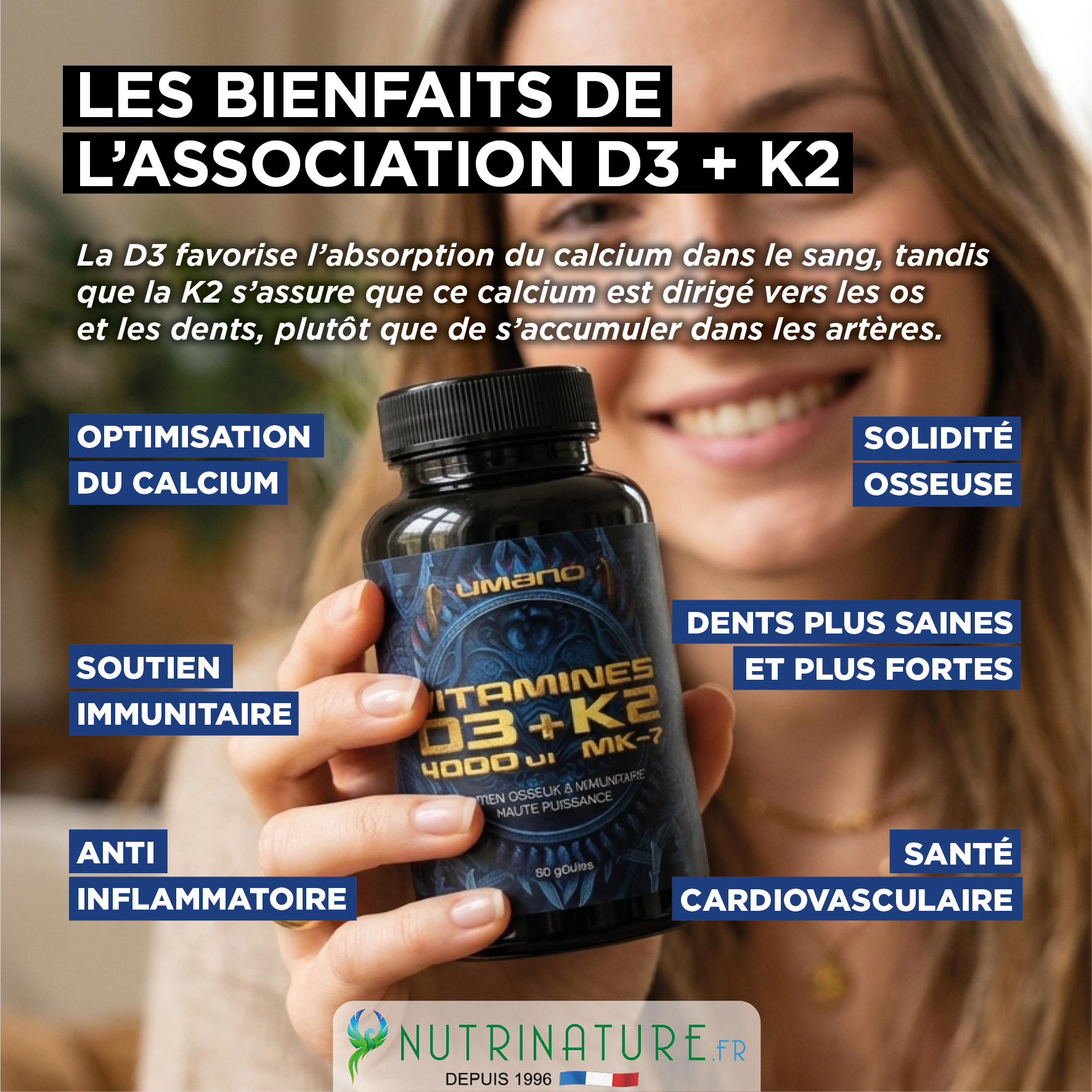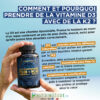 C'est le bénéfice principal. La Vitamine D3 augmente l'absorption du calcium dans le sang. Cependant, sans Vitamine K2, ce calcium peut errer sans but.